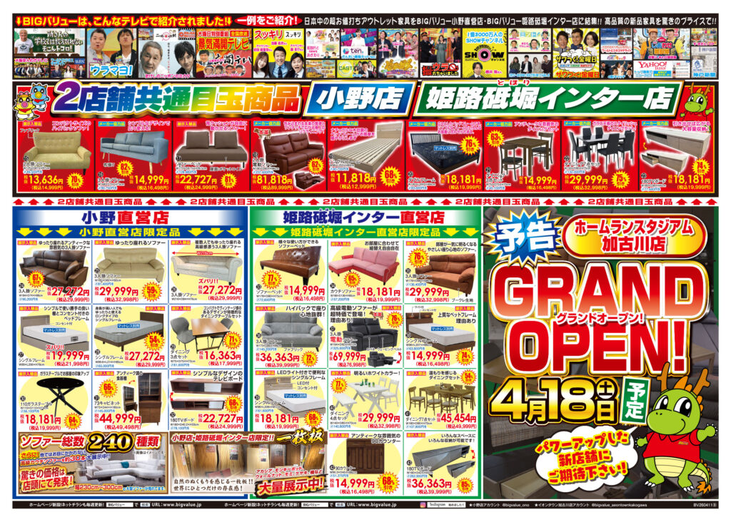 小野店・姫路砥堀インター店では、ソファやベッド・食卓などの大型家具から